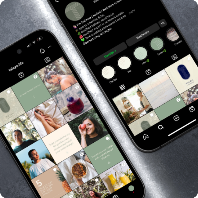 Der Social Media Kanal ist dem Branding der Marke Talaya Wellness angepasst. Hier finden sich sowohl die Farben, als auch die fliessenden Formen der Marke in den Postings wieder. Der Social Media Kanal repräsentiert Natürlichkeit, Nachhaltigkeit, Gesundheit und Weiblichkeit.